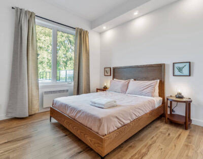 The Travel Paradise, a ground floor unit in vibrant woody hues, is perfect for accommodating groups of 4 or 6 adventurers. You have a bedroom with a king-size bed and plenty of storage, as well as a sofa bed and a murphy bed in the living room.